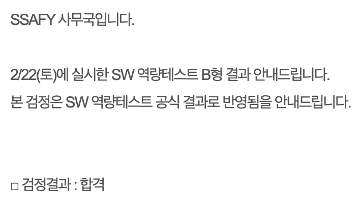 2025년 2월 B형 역량테스트 시험을 보라고 연락이 왔다. 원래 A형을 취득한 사람만 볼 수 있었는데, 나는 A형은 없었지만 SSAFY 입과 코딩 테스트에서 좋은 결과가 있으면 바로 B형 응시가 가능하다고 했던 것 같다. 입과 테스트를 잘 봤나보다.