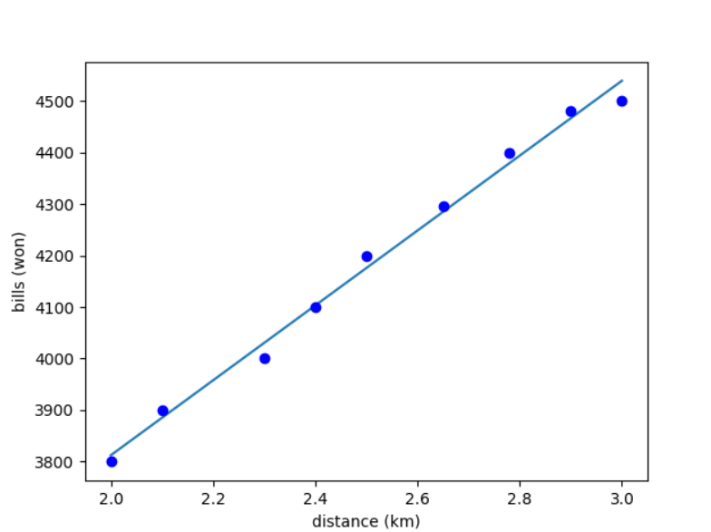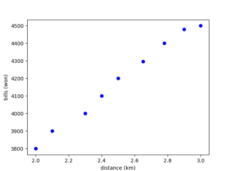 거리에따른 택시 요금의 실제 데이터라고 가정합시다. 이 데이터는 걸린 시간을 가정하지 않았습니다. 따라서 그래프의 점들이 균일하지 않습니다.