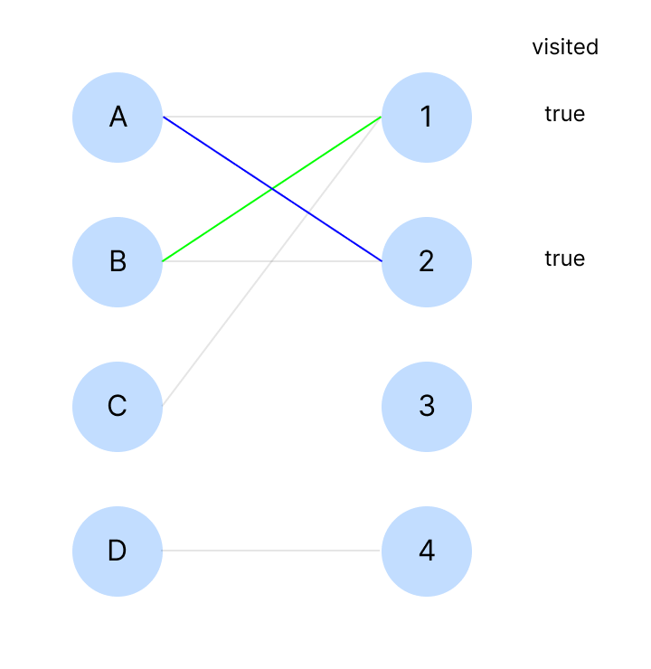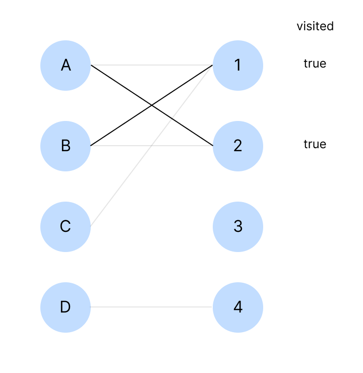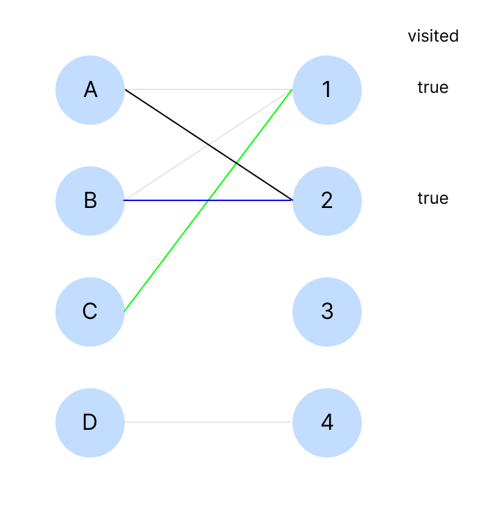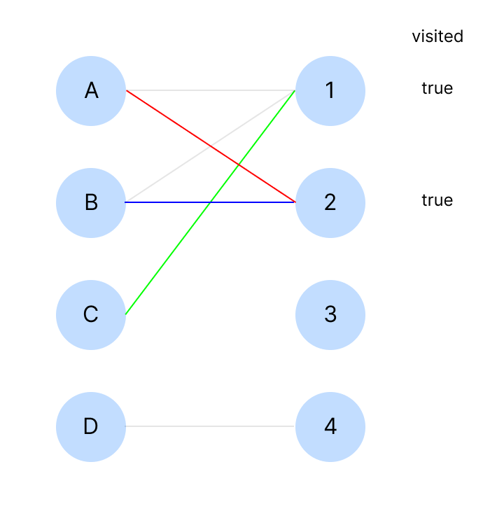 B는 2와 연결할 수 있다. 하지만 2는 A가 점유하고 있으니 A에 대해 탐색(dfs) 한다