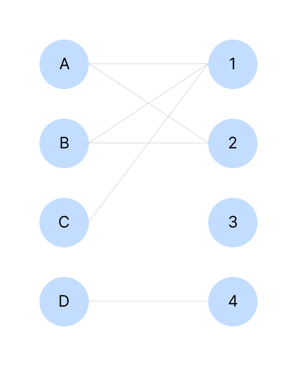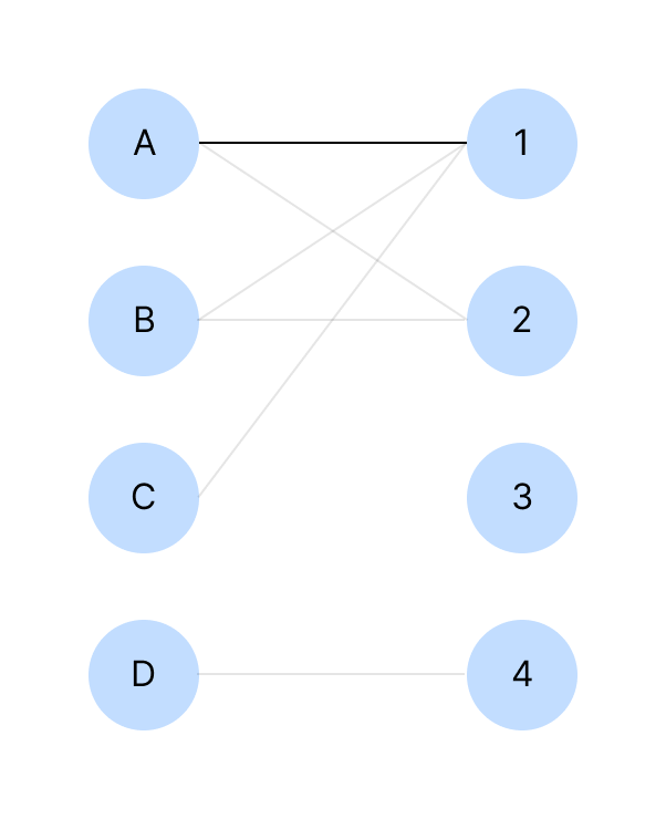 B는 1에 연결할 수 있다. 하지만, 1은 A에 의해 점유된다.