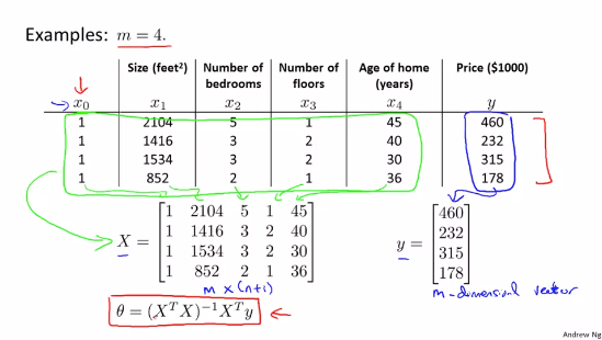 여기 m 가지 featrues(특징)과 n 가지 training example(훈련집합의 갯수)가 있습니다. 그리고 X와 y를 각각 위와같이 정의하면 θ는 다음과 같은 식으로 얻을 수 있습니다. θ=pinv(X'*X)*X'*y
