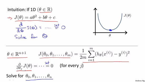 θ는 n+1차원의 벡터라고 가정합시다. 그리고 비용함수도 위 사진의 아래와 같다고 가정합시다. 이렇게 되면 비용함수는 모든 θ_j에 대해서 편미분을 하고 0이되는 값을 찾으면 그 값이 최적의 θ값이 될겁니다.