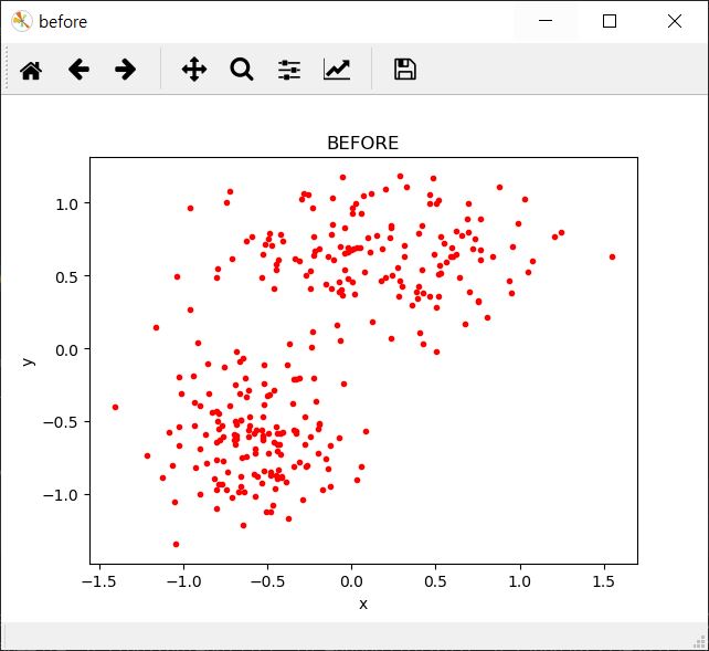 y = np.array((np.random.normal(-0.6, 0.3, half), np.random.normal(0.6, 0.3, half + numData % 2)))